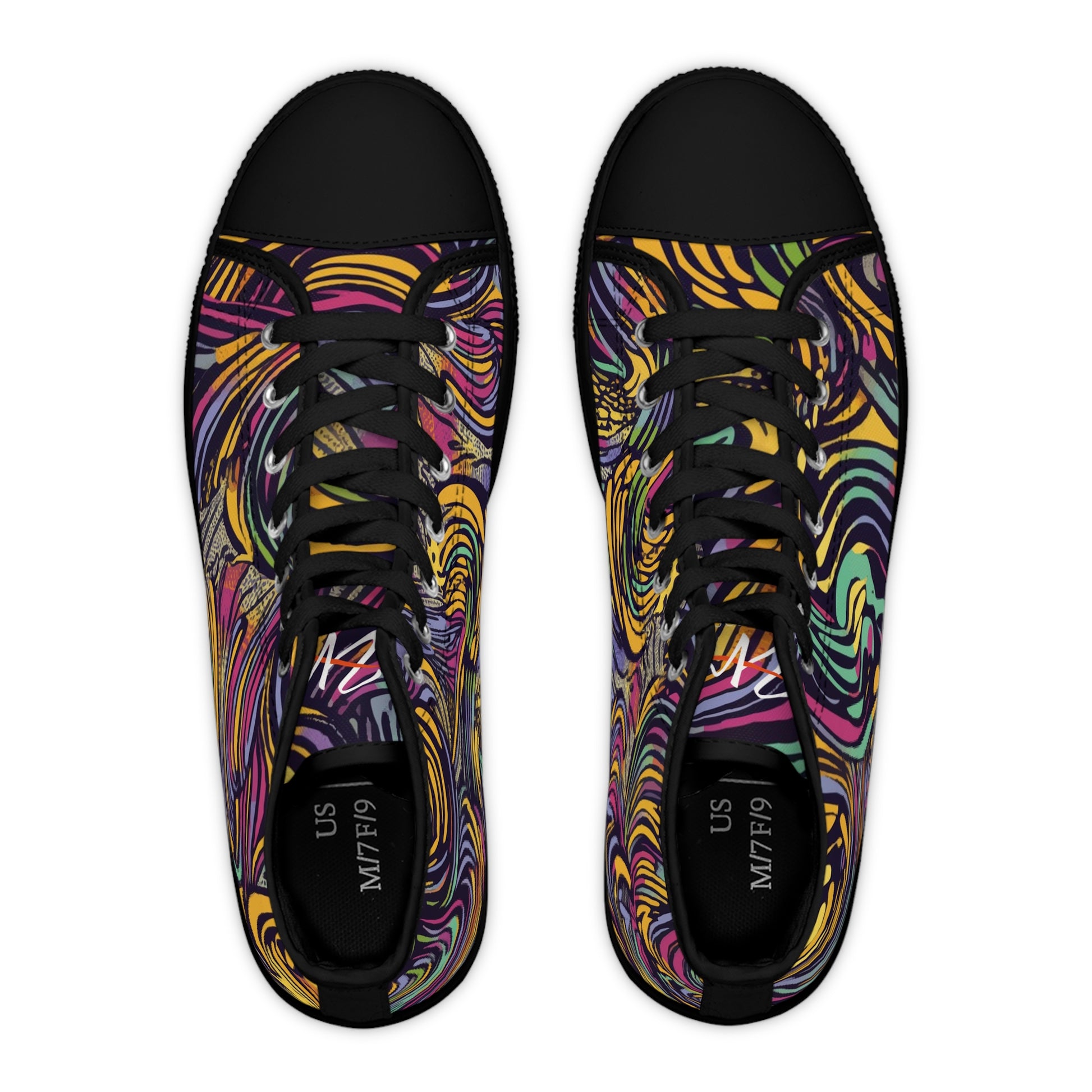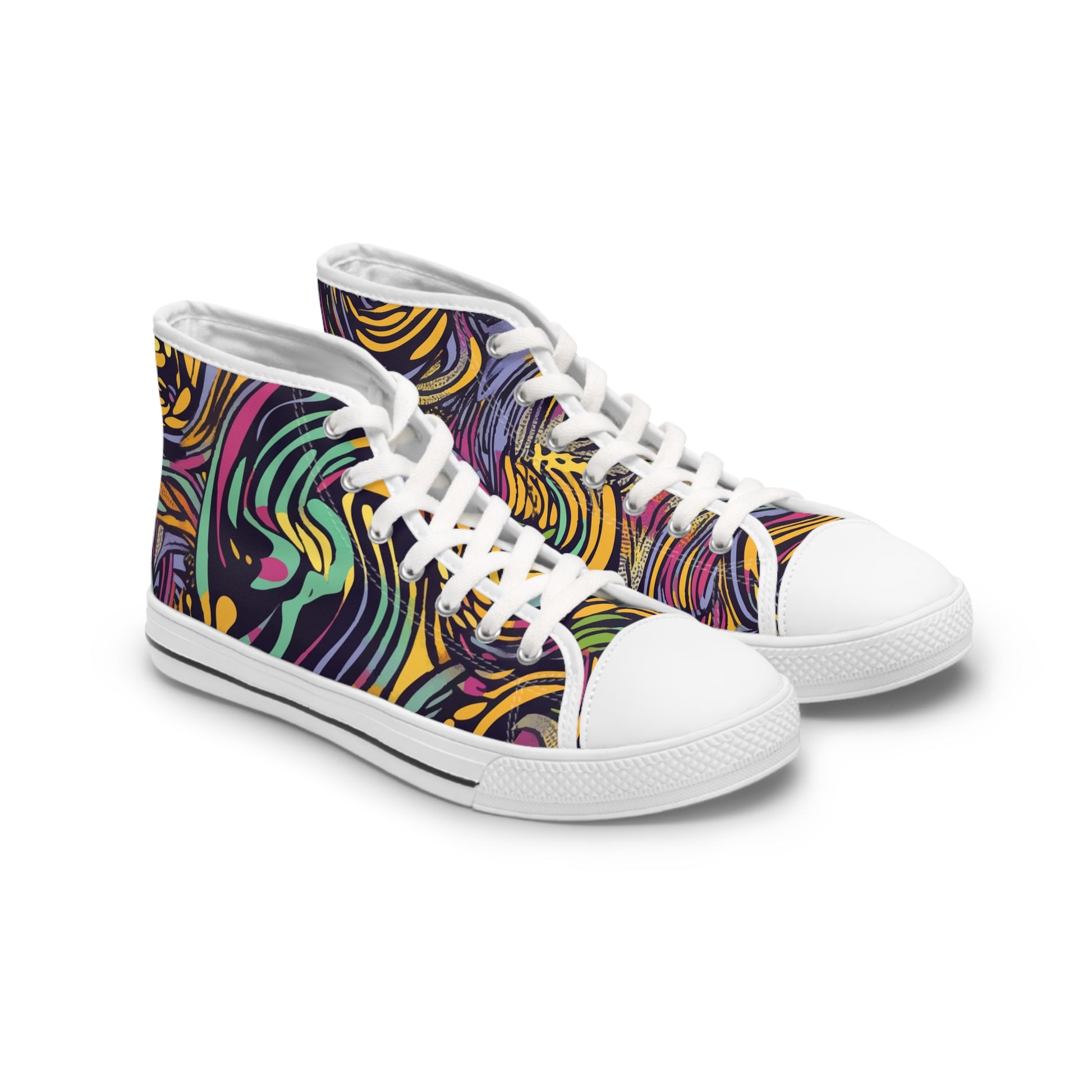 Add a splash of artistic energy to your step with the **Pop Art Flow Women's High Top Sneakers**. Designed for bold expression, these sneakers feature a breathable polyester canvas with PU leather accents, an all-over wraparound print, and striking pop art-inspired patterns. Enjoy superior comfort with EVA deodorant memory foam insoles and a durable rubber outsole for lasting wear. Available with black or white details.