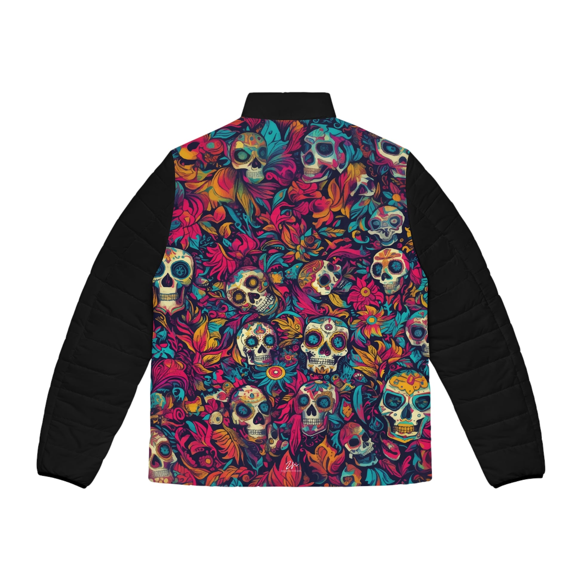 Celebrate culture and color with this Día de los Muertos-Inspired Custom Puffer Jacket – featuring vibrant sugar skulls and floral motifs that honor Mexican traditions. This lightweight jacket blends striking artistry with everyday practicality, including a stand-up collar, quilted lining, black cuff details, and spacious side pockets. Perfect for those who embrace bold designs and cultural heritage in their fashion.