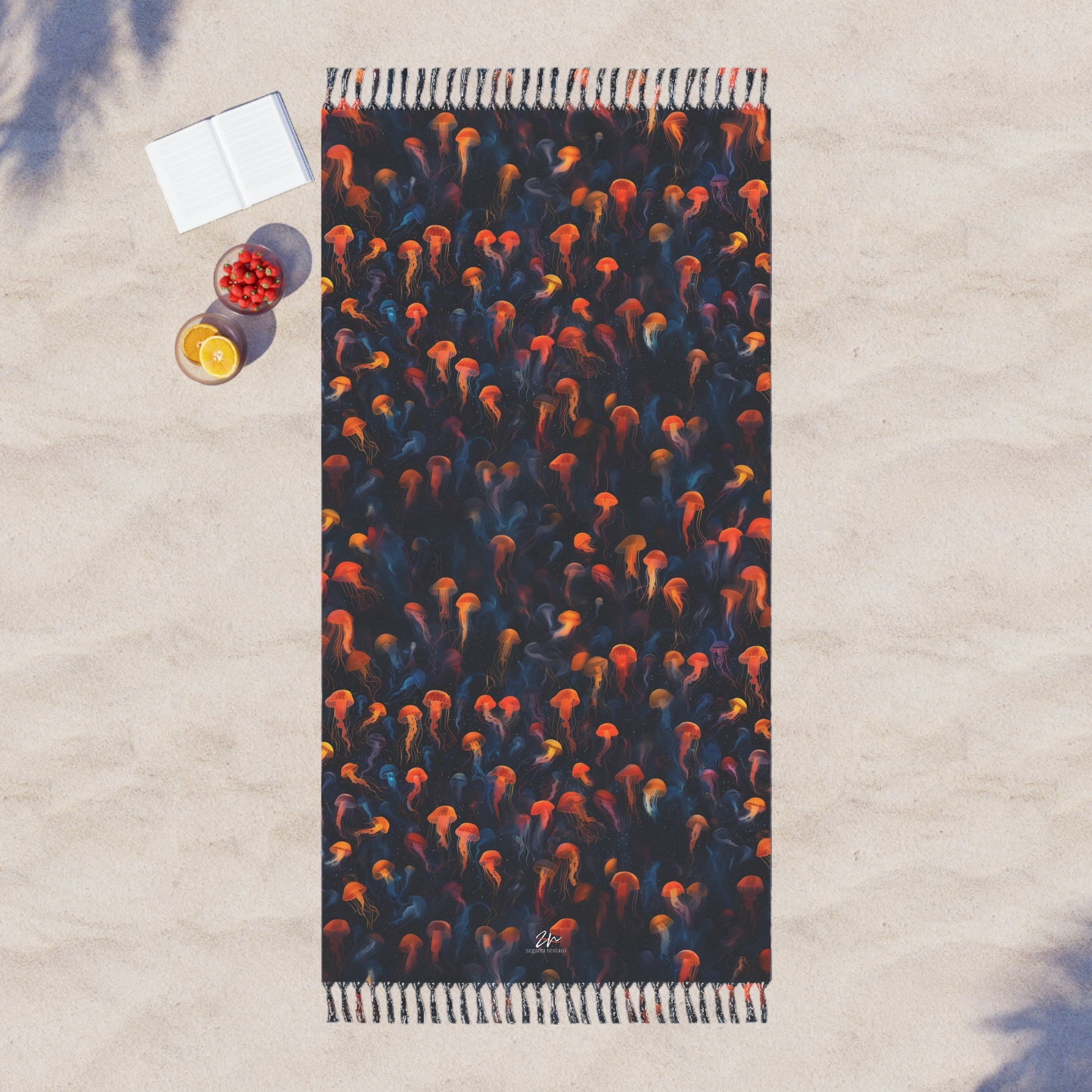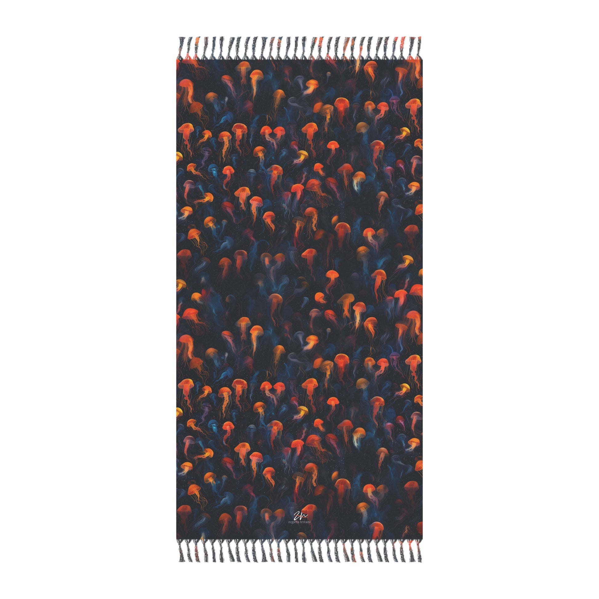 Immerse yourself in a sea of elegance with the Jellyfish Drift Boho Wrap. Featuring a mesmerizing design of vibrant jellyfish drifting across a deep ocean backdrop, this versatile wrap exudes bohemian charm. Lightweight, soft, and perfect as a beach blanket, stylish shawl, or decorative throw. Elevate your outings and home décor with this artistic and functional masterpiece!